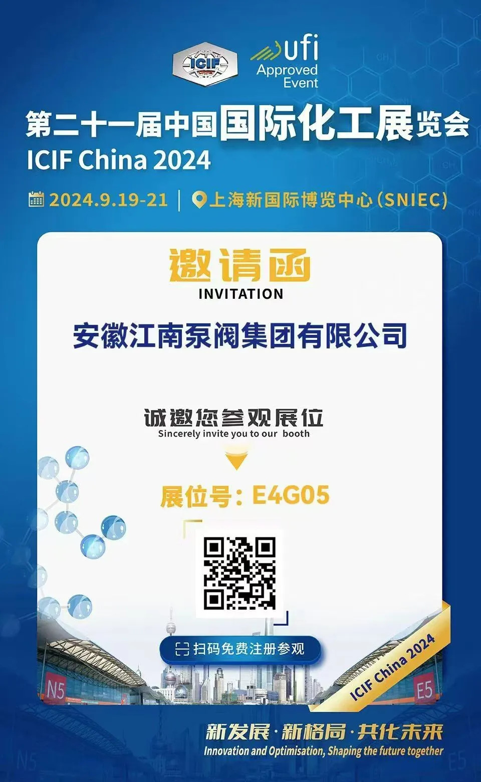 安徽江南泵閥集團(tuán)有限公司于2024年9月19日-21日在上海新國(guó)際博覽中心參加第二十一屆中國(guó)國(guó)際化工展覽會(huì),展位號(hào)為E4G05。我們誠(chéng)摯邀請(qǐng)您蒞臨展位參觀指導(dǎo)!