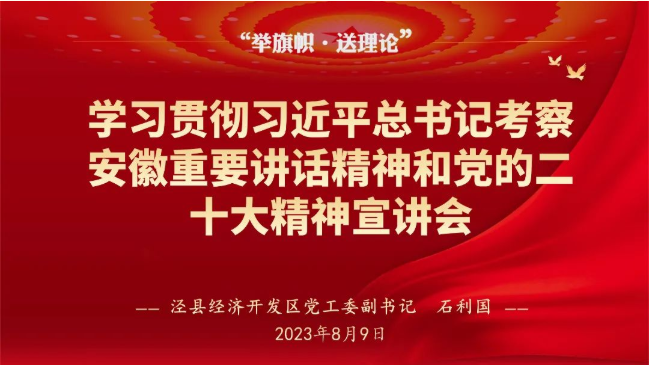 8月9日,涇縣經(jīng)濟開發(fā)區(qū)黨工委副書記石利國走進安徽江南泵閥集團有限公司,開展“舉旗幟 送理論”學(xué)習(xí)貫徹習(xí)近平總書記考察安徽重要講話精神和黨的二十大精神宣講會。