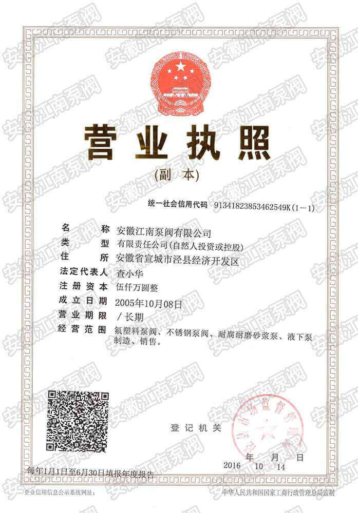 安徽江南泵閥有限公司榮獲泵閥營業(yè)執(zhí)照,主營:氟塑料泵,不銹鋼泵,耐腐蝕化工泵,品質(zhì)卓越,行業(yè)領(lǐng)跑企業(yè),科研生產(chǎn)型企業(yè)20年鑄就行業(yè)輝煌!...